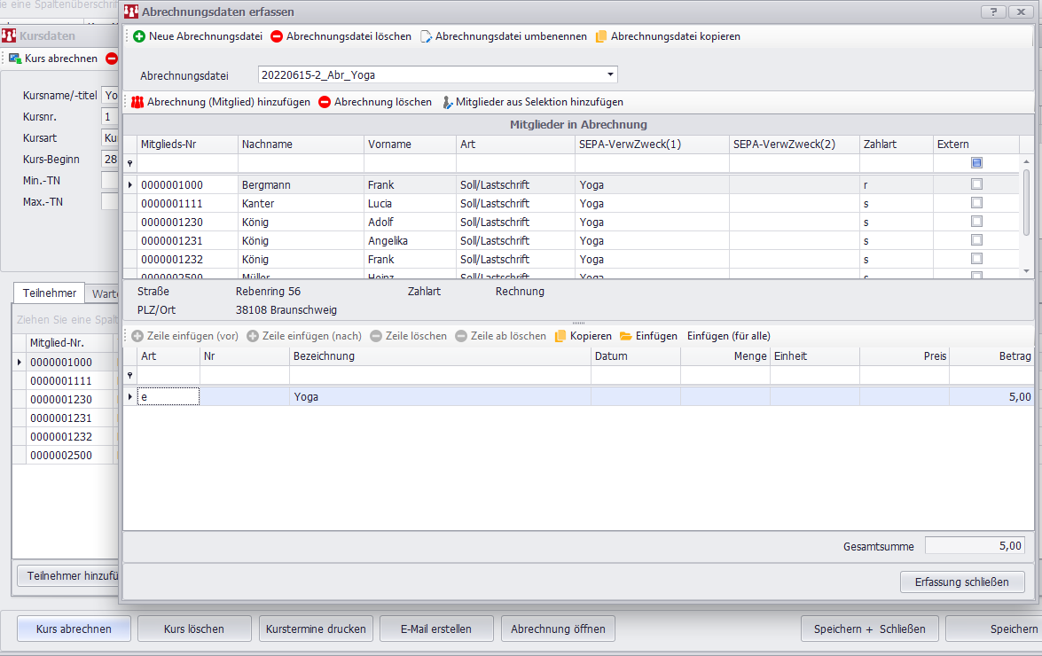 Um einen Kurs abzurechen, klicken Sie auf den Button "Kurs abrechnen". Danach können Sie sich die Abrechnungsdatei anzeigen lassen. Diese Datei kann über einen Abrechnungslauf abgerechnet werden.