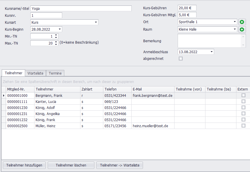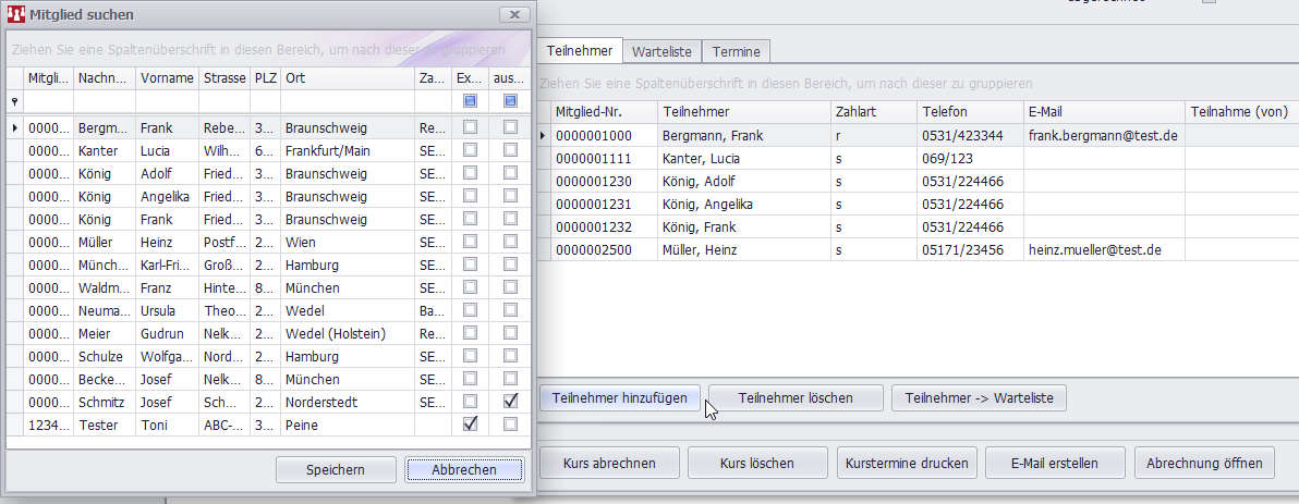 Hier können Sie Teilnehmer in den Kurs aufnehmen, löschen oder auch externe Teilnehmer festlegen.