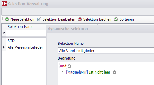 Menü Mitglieder/ Selektionen/Sortieren - Selektionen verwalten - Neue Selektion