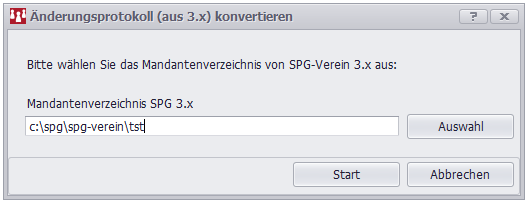 Legen Sie bitte über die Schaltfläche "Auswahl" fest, wo der gewünschte SPG-Verein 3.x-Mandant gespeichert ist. In der Auswahlmaske suchen Sie den zu konvertierenden Bestand in Ihrem Datenverzeichnis heraus und bestätigen Ihre Auswahl mit der Schaltfläche „Start".