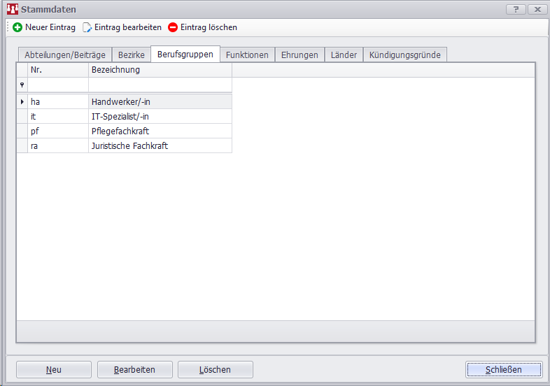 Sie können Änderungen an den Berufsgruppen vornehmen. Durch Doppelklick auf eine Berufsgruppe gelangen Sie in das Bearbeitungsfenster für die Berufsgruppe.