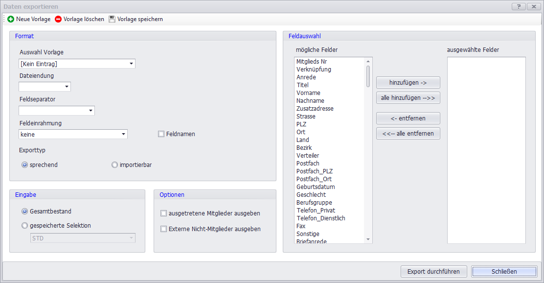 Es kann bestimmt werden, ob ausgetretene bzw. Externe Mitglieder beim Export berücksichtigt werden sollen.
