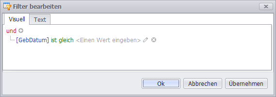 Auf der Registerkarte „Text“ bekommen Sie die gerade eingegebenen Filterkriterien in programmtechnischer Schreibweise angezeigt.