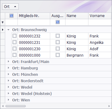 Die unterschiedlichen Orte werden untereinander dargestellt und durch Klick auf den Pfeil vor einem Ort, bekommen Sie alle Mitglieder angezeigt, bei denen der jeweilige Ort (im Beispiel „Braunschweig“) eingetragen ist.