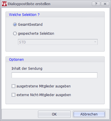 Neben der Möglichkeit, auch ausgetretene Mitglieder mit in die Auswahl einzuschließen, können Sie eine Inhaltsangabe zur Sendung vorgeben. Hierfür stehen 35 Zeichen zur Verfügung. Die Vorgabe wird in der Kopfzeile der Liste angedruckt.