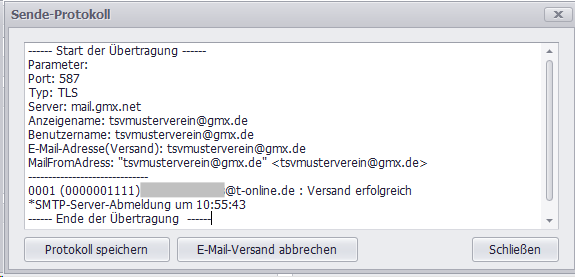 Zur Kontrolle wird ein Sendeprotokoll geführt, aus dem der Sendestatus, die E-Mail mit vorangestellter fortlaufender Nummer sowie die An- und