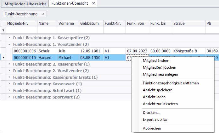 Hinter der Funktion-Bezeichnung bekommen Sie angezeigt, wieviel Mitglieder eine entsprechende Funktion ausgeübt haben.