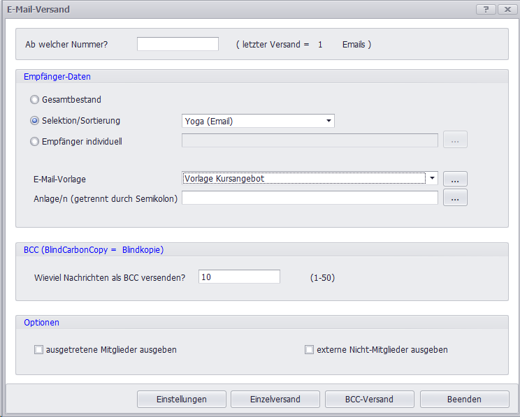 Erläuterungen zu "Einzelversand" bzw. "BCC-Versand" finden Sie im Abschnitt "Mitglieder" > "E-Mail-Versand".