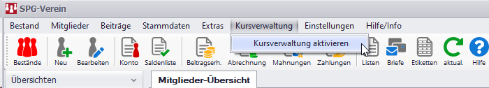 Wenn Ihnen das Programm-Modul SPG-Kurs zur Verfügung gestellt wurde, dann wird in der Menüzeile der Menüpunkt "Kursverwaltung" angezeigt.