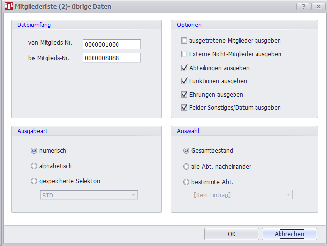 Auch hier besteht die Gelegenheit, ausgetretene Mitglieder mit anzeigen zu lassen. Außerdem haben Sie eine Wahlmöglichkeit, neben den Standardangaben (Mitgliedsnummer, Name, Vorname, Geschlecht, Anrede, Anzahl Ausweise und Zeitschriften, Berufsgruppe sowie Eintritts- und Austrittsdatum) auch Aussagen hinsichtlich Abteilungen, Funktionen, Ehrungen und den Inhalt der Felder 'Sonstiges 1 und 2' der Mitglieder in die Liste aufzunehmen.