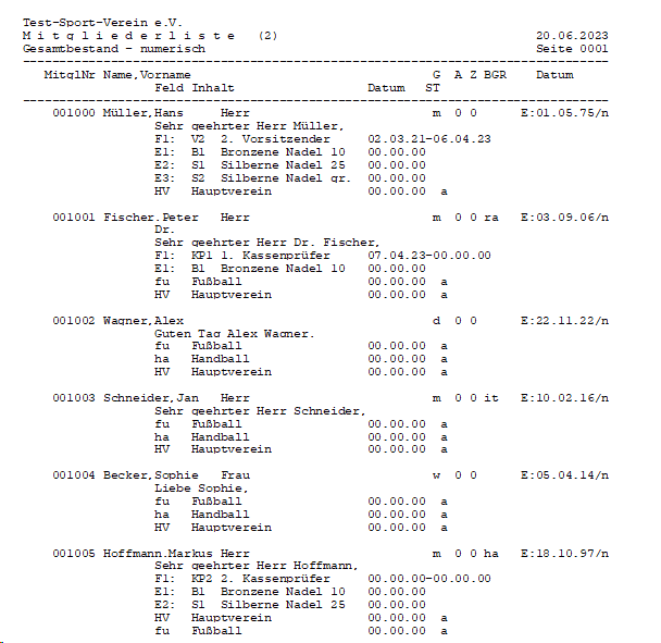 In dieser Liste werden die übrigen Stammdaten der Mitglieder ausgegeben, die nicht adressen- bzw. beitragsbezogen sind.