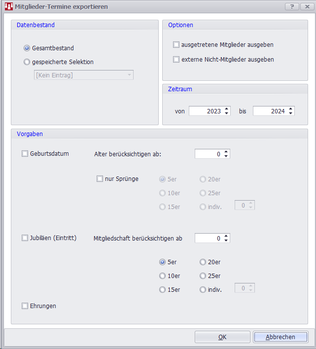 Es können entweder die Termine aller Mitglieder oder nur derjenigen Mitglieder, die in einer Selektion gespeichert sind, exportiert werden.