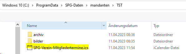 Diese Exportdatei wird dort unter dem Namen "SPG-Verein-Mitgliedertermine.ics" gespeichert.