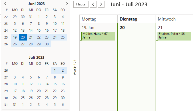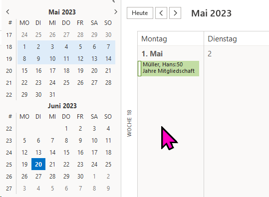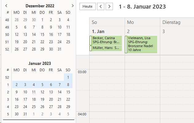 Als Beispiel dient Outlook 365; weiter unten sind Screenshots aufgelistet, wie die unterschiedlichen Termine (Geburtstag, Jubiläen(Eintritt), Ehrungen) im Outlook-Kalender dargestellt werden.