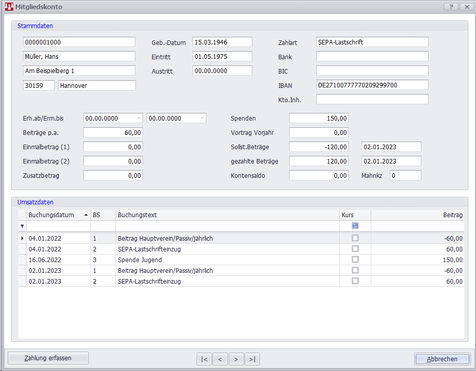 Mit der Auswahl erscheinen im oberen Bereich des Bildschirms Stammdaten des Mitglieds, während in der unteren Bildschirmhälfte die