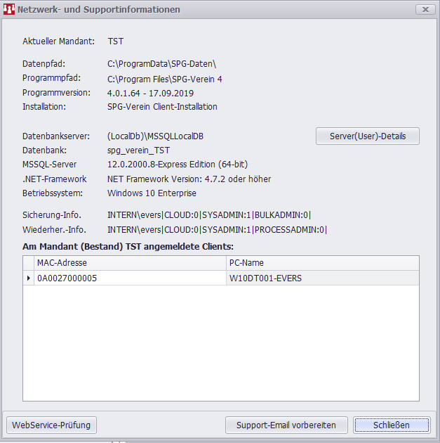 Auf diesem Formular werden sehr viele Daten angezeigt, die für einen möglichen Support benötigt werden.