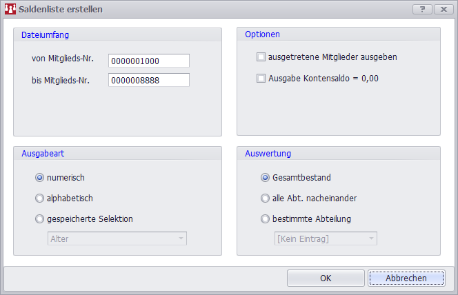 Unter 'Optionen' haben Sie die Möglichkeit, ausgetretene Mitglieder mit einzubeziehen bzw. auch Konten mit dem Saldo 0,00 auszugeben.