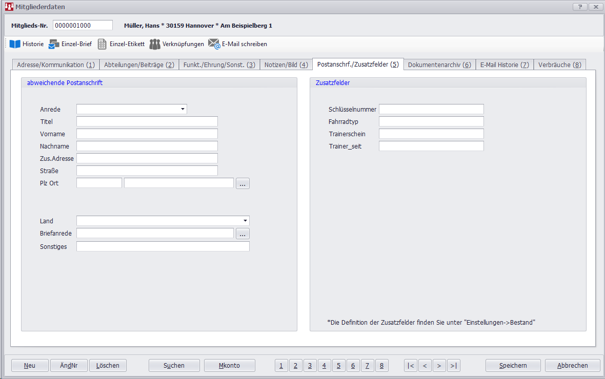 Hier hat der Anwender die Möglichkeit individuelle, bestandsbezogene Daten zum jeweiligen Mitglied aufzunehmen, und zwar mit der vollen Auswertbarkeit in den jeweiligen Listen. Diese Daten können je nach verwaltetem Bestand und Verein völlig unterschiedlich sein. Für einen Segelclub mag beispielsweise der zugehörige Bootstyp des Mitglieds interessant sein, für den nächsten der jeweilige Fortbildungsgrad bis hin zu Spezialqualifikationen. Natürlich sollte an dieser Stelle das jeweilige Datenschutzrecht beachtet werden. Nicht alles, was verwert- und auswertbar ist, darf auch entsprechend gespeichert und verwendet werden.