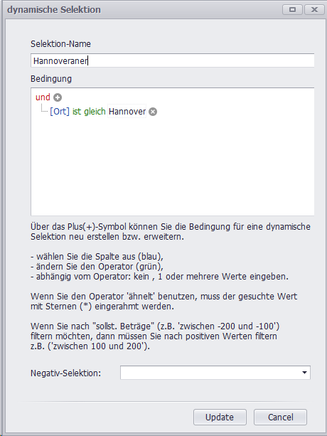 Die Selektionskriterien können Sie dann in diesem Fenster definieren: