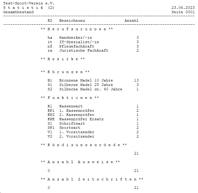 In dieser Statistik werden die sonstigen Stammdaten ausgewertet (Berufsgruppen, Bezirke, Ehrungen, Funktionen, Kündigungsgründe, Anzahl Ausweise, Anzahl Zeitschriften).