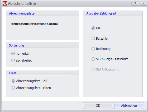 Eine Abrechnungsdatei kann sowohl Gutschriften (Haben) als auch Belastungen (Soll) enthalten. Daher ist dementsprechend eine getrennte Ausgabe der Abrechnungsliste-Soll und /-Haben vorgesehen und unter Listenart auszuwählen. Zur besseren Übersichtlichkeit kann die Zahlungsart eingeschränkt werden – per Default werden alle Arten ausgegeben.