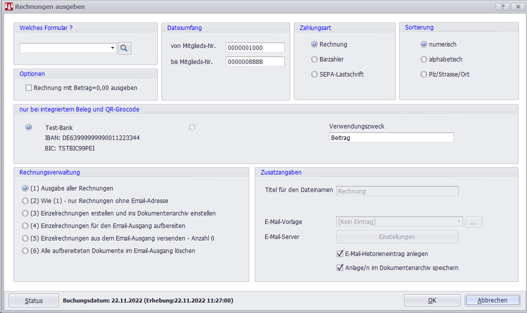 Nach Aufruf der Funktion Rechnungen ausgeben wird obiges Formular angezeigt mit folgenden Einstellmöglichkeiten: