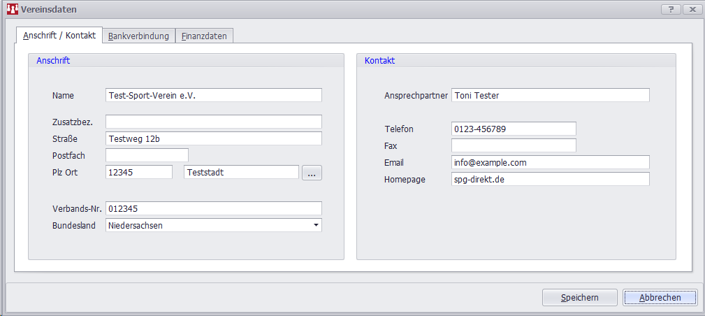 Sie können die Anschrift und die Kontaktdaten des Vereins eingeben.