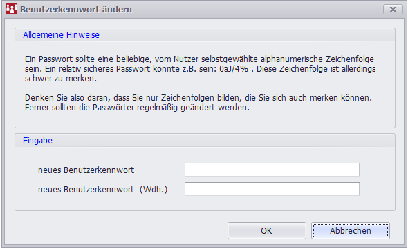 Der aktuell angemeldete Benutzer hat die Möglichkeit sein Benutzerkennwort zu ändern. Um Tippfehler auszuschliessen, muss das neue Passwort 2-Mal korrekt eingeben werden.