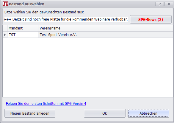 Außerdem ist in diesem Auswahl-Fenster ein Newsticker integriert, der dem Anwender Hinweise gibt, dass es eine bestimmte Anzahl von Neuigkeiten zu SPG-Verein auf der Internetseite "www.spg-direkt.de" gibt.