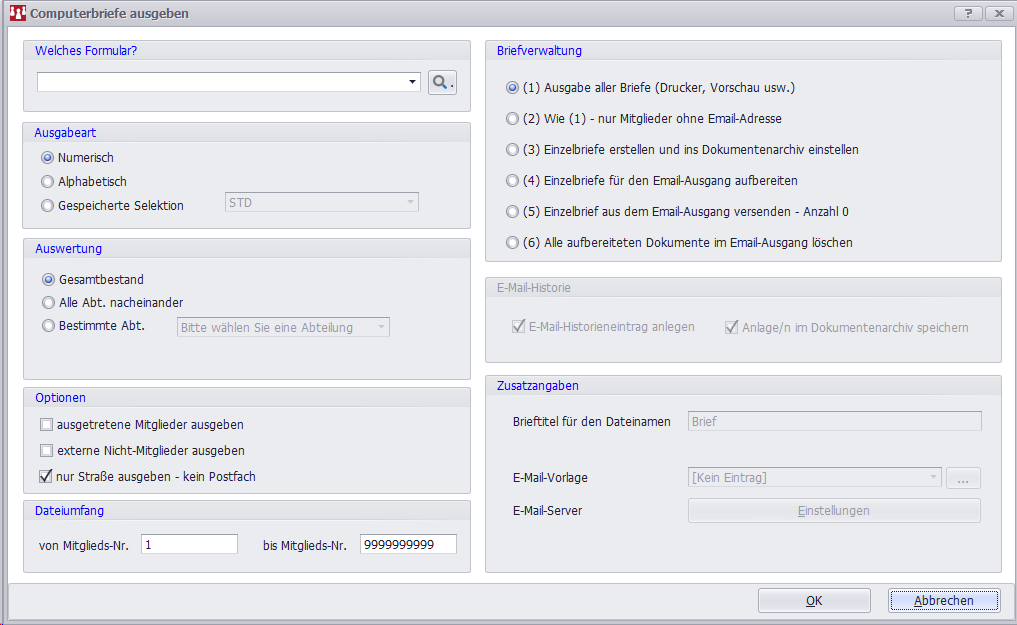 Nach Aufruf der Funktion [Briefe ausgeben] wird dieses Formular angezeigt: