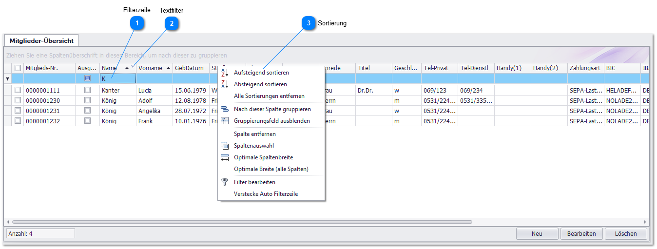 Um die Mitglieder noch weiter zu filtern, tragen Sie in das Filterfeld der entsprechenden Spalte das Filterkriterium ein.