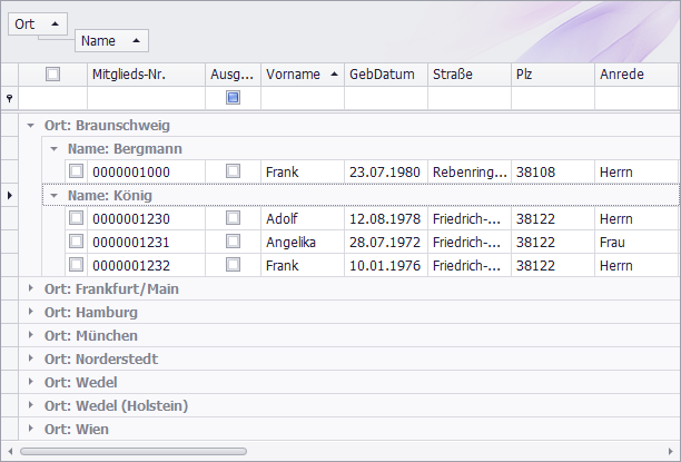 Sollen die Mitglieder zusätzlich nach Name gruppiert werden, ziehen Sie die Spaltenüberschrift „Name“ in den o.g. Bereich. Die Mitglieder werden dann zuerst nach Ort und darunter nach Name gruppiert.
