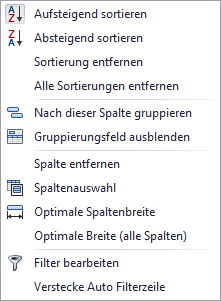 Das Kontextmenü des Datengrids wird aufgerufen, wenn Sie mit der rechten Maustaste auf die Spaltenüberschrift klicken.
