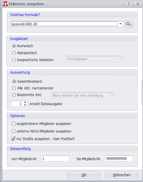 Nach Aufruf der Funktion Etiketten ausgeben werden als erstes Etikettenauswahl (Dateiname), Ausgabemedium und Dateiumfang erfragt. Danach sind Ausgabeart und Auswertung zu definieren. Schließlich kann über den Bereich Optionen die Selektionsmöglichkeiten angepasst werden.