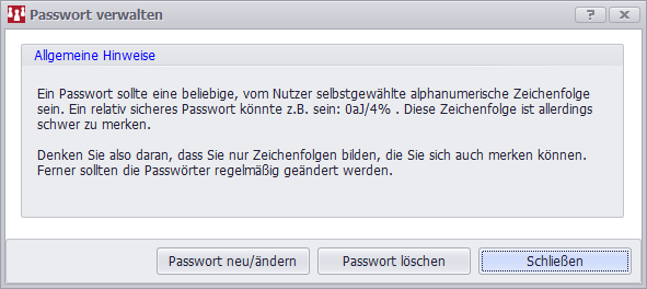 Zum Setzen eines Passwortes bzw. zum Ändern eines bestehenden Passwortes ist lediglich die Betätigung der Schaltfläche [Passwort neu/ändern] notwendig; eine Abfrage des bisherigen Passwortes findet nicht statt. Nach der Eingabe eines maximal sechsstelligen Kennwortes  und der sich anschließenden Wiederholung (um Tippfehler zu vermeiden) ist der Kennwortschutz aktiv. Ab dem nächsten Aufruf des Mandanten wird das vergebene Kennwort abgefragt. Es ist zu beachten, dass alle nachfolgenden Passwortaktionen (Ändern/Löschen) erst nach erfolgreicher Mandantenanmeldung möglich sind.
