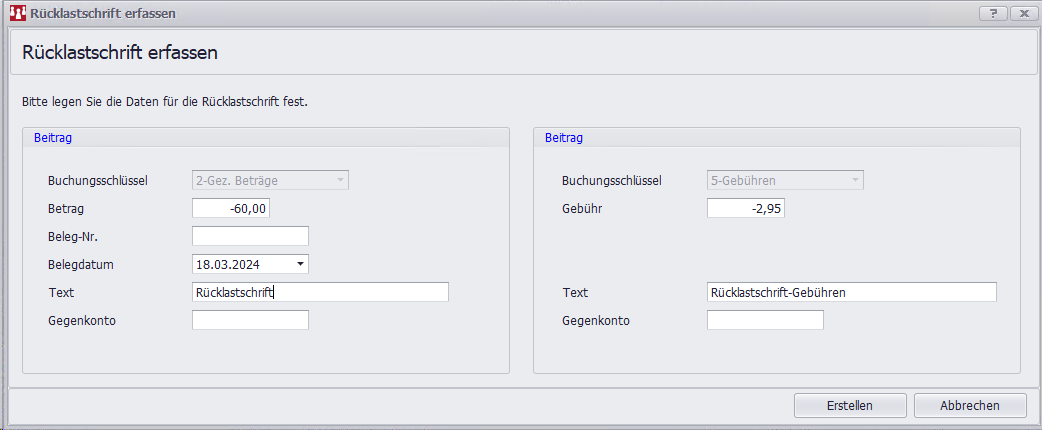 Unter "Beitrag" geben Sie den normalen Beitrag welcher zurück überwiesen wurde an und unter "Gebühr", die Bearbeitungsgebühr an. Keiner der beiden Beträge kann positiv sein. Zum Schluss klicken Sie auf "Erstellen".