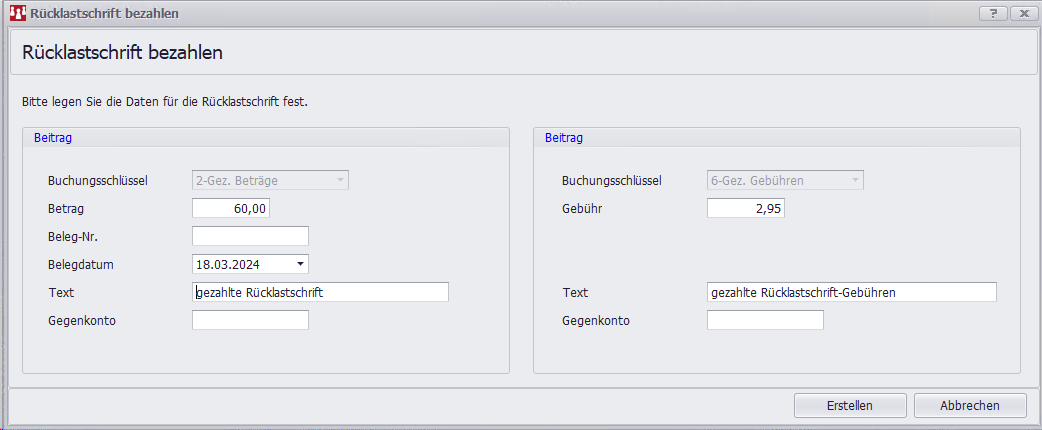 Wenn es zu Rücklastschriften mit zusätzlichen Bearbeitungsgebühren kommt, so können diese Zahlungen hier erfasst werden: