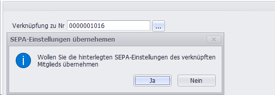Wenn einem Mitglied eine Verknüpfung zu einem anderen Mitglied (mit Zahlart SEPA) zugeordnet wird, kann der Anwender entscheiden, ob die SEPA-Daten für das aktuelle Mitglied übernommen werden sollen.