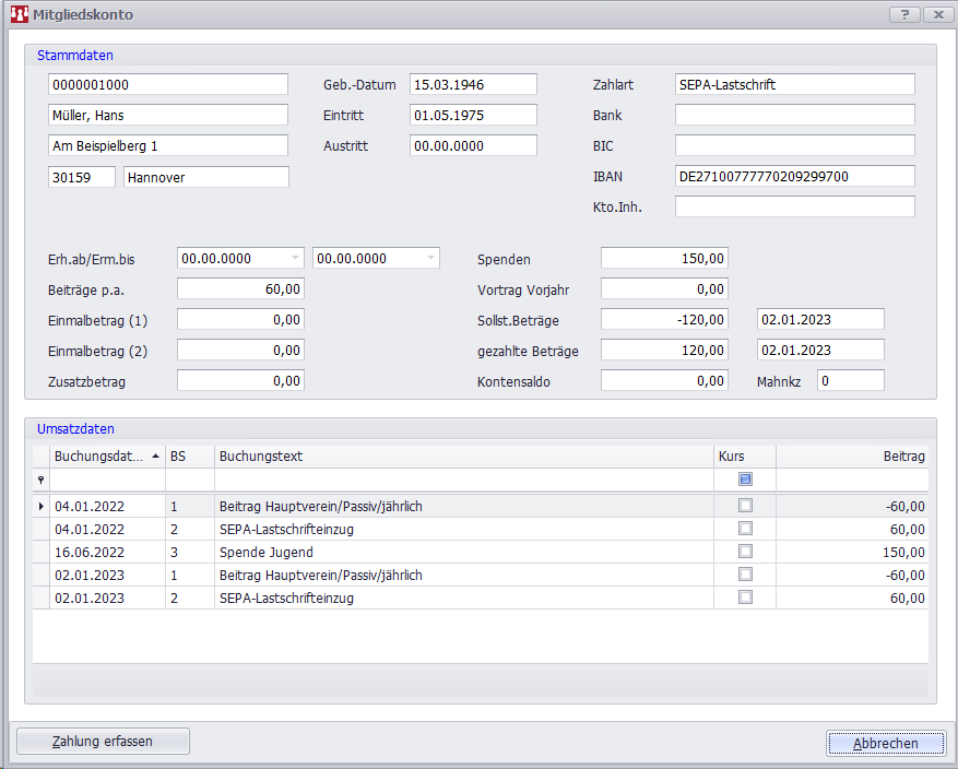 2 : Gezahlte Beträge (z.B. per SEPA eingezogene Beiträge, manuelle Zahlung)