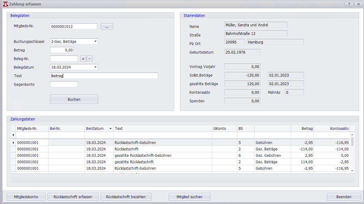 Unter dieser Funktion können alle Zahlungen manuell gebucht werden, die aus der Beitragserhebung als offene Posten resultieren; weiterhin sind Bestandskorrekturen möglich. Für die erfassten Beträge erfolgt eine Verrechnung mit den entsprechenden Feldern aus den Mitgliedsdaten.